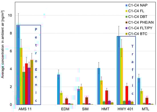 Dibenzothiophenes (DBTs), another class of PACs enriched in fossil fuels, exhibited a similar spatial distribution pattern as alkyl-PAHs (Figure 2C). DBTs are sulfur containing alkyl-PAHs that are partially removed from raw petrogenic materials during desulfurization and other cleaning and refining processes for the purpose of oil upgrading [54]. According to the Environment Canada report, sulfur content in motor gasoline in Canada during 2015–2016 ranged from 16 to 18 mg/kg, in low-sulfur diesel fuel from 416 to 739 mg/kg, and in high-sulfur diesel fuel from 1048 to 1472 mg/kg [54]. Therefore, elevated levels of DBTs observed at the HWY401 (median = 1.9 ng/m3) and HMT (median = 1.3 ng/m3) sites suggest eminent use of less refined fuels, such as diesel, at those sites as compared to other studied sites (Figure 2C). However, the distribution of DBTs relative to alkyl-PAHs differs amongst the sites (Figure 3B). These data indicate that HMT emissions are impacted to a higher degree by less refined petrogenic materials (likely higher-sulfur diesel industrial machineries and engines). The data from EDM and MTL show a lower influence from diesel emissions. As seen for AMS11 (Figure 3B), fugitive emissions from raw and unrefined fossil materials are characterized by the most elevated DBT content.