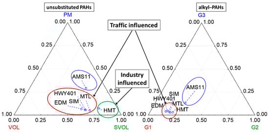 In contrast, the alkyl-PAH concentration groupings are all clustered very closely for all NAPS sites (Figure 6), indicating similar composition and therefore suggesting similar emission sources of alkyl-PAHs. Furthermore, HMT does not show a distinct composition for alkyl-PAHs like for unsubstituted PAHs, indicating that additional emissions at the HMT site are enriched in industry-influenced unsubstituted PAHs but not in alkyl-PAHs. Concentration cluster groupings show that NAPS sites are dominated by G1-VOL alkyl-PAH fraction (C1–C4 NAP, C1–C4 FL, DBT) at 75–80% and have lower content of G3-PM alkyl-PAH (C1–C4 FLT/PY, C1–C4 BTC) compared to typical oil sands concentration clustering at AMS11.