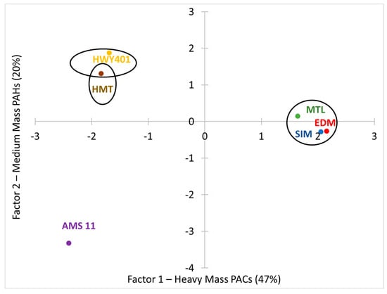 The Principal Component Analysis plot presented in Figure 7 incorporates all sites and target analysis from FA in a projection of cases on factor-plane. The five NAPS sites are grouped together under Factor 1 “heavy mass” PACs; however, two subgroups can be distinguished in the upper portion of the plot. Factor-plane PCA shows that although MTL, SIM, and EDM are clustered together through two factors—Factor 1 (“heavy mass” PACs) and Factor 2 (“medium mass” PAHs)—these sites do not demonstrate distinct PAC profile, indicating mixed influence of traffic and local PAC sources. Subgroup HWY401 and HMT has the same X-axis value, which suggests that these two sites show the same variability of “heavy mass” PACs, most probably a similar source such as transportation. However, here most of the variability between these two sites is on the Y-axis (“medium mass” PAHs) which suggests different sources of these compounds, as already demonstrated on the Ternary Plot (Figure 6). It is the Factor 2 PAHs that make HMT different due to the potential impacts from the steel industry emissions. PCA indicates that the AMS11 site was influenced by a different profile of PACs than that of the NAPS sites, reflecting raw petrogenic materials and processing emissions.