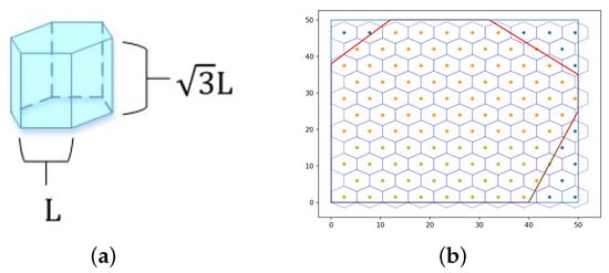 During an atmospheric environment detection mission, the study area A (space of interest) is decomposed using the hexagonal prism unit to generate points of interest covering sampling, and then the sampling path is mapped. As shown in Figure 1, the basic decomposition unit is a regular hexagonal prism with a height of ; its base is a regular hexagon with a side length of L and the six side edges are perpendicular to the base. The entire study area is uniformly decomposed by the basic unit of the hexagonal prism. In the vertical direction, the space of interest is divided into subspace regions of interest with the same height. The basic unit whose centroid is in the study area is called the sub-region of interest, and these centroids are the sampling locations used to collect data samples. For a given study area and L, the number N of decomposed subspace regions of interest, the set M of sub-region of interest in a single subspace and their number |M| can be obtained. When the UAV collects environmental data, the navigation path requires access to each sub-region of interest. Suppose the planned path is P and the path length is |P|, as shown in Formula (1).