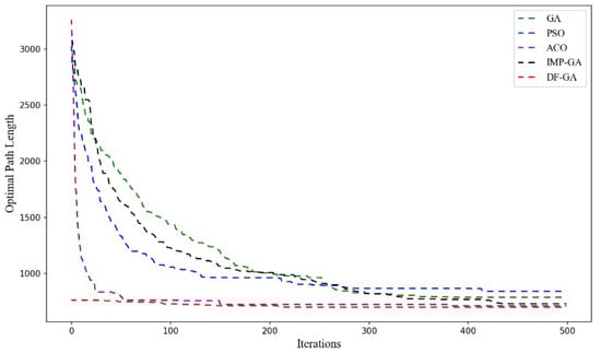 As can be seen from Figure 3, the DF-GA has a better initial population and the convergence value is significantly lower than other algorithms. Combined with Table 1, our algorithm solves an average path of 699.04, which is only 3.44% different from the optimal path of 675. Compared to GA, PSO, ACO, and IMP-GA, path lengths are reduced by 6.14%, 12.30%, 2.77%, and 5.33%, respectively, significantly, and reduce convergence iteration algebra and convergence time. The results show that our Genetic Algorithm can obtain a better path in a shorter time, has fewer iterations, and can effectively avoid falling into local optimization.