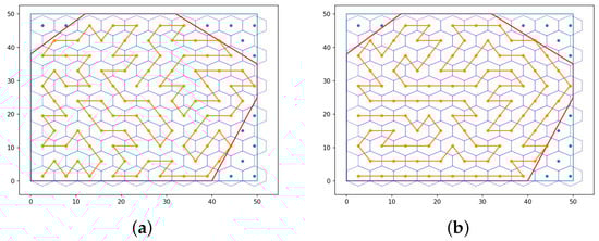 Path planning results. (a) Result of GA with the sum of angles 114.14; (b) result of DF-GA with the sum of angles 92.15, whose sum of turn angles is smaller than the GA result, with more straight paths.