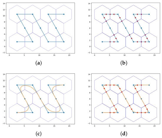 Supplementary waypoint interpolation. (a) Raw waypoint. (b) Supplementary Interpolated Post Waypoints. (c) Raw Waypoint Curve Fitting. (d) Waypoint curve fitting after supplementary interpolation.