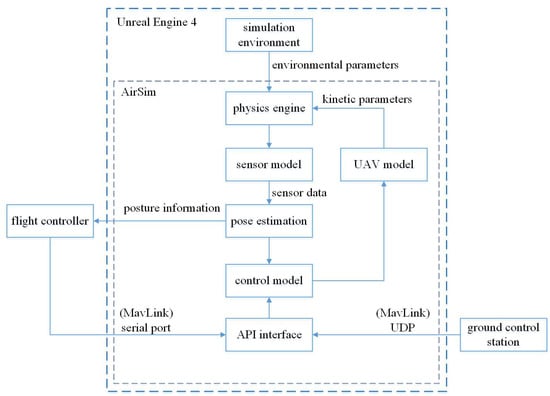 The simulation system, shown in Figure 7, mainly includes the AirSim simulation platform, Pixhawk4 flight controller and UAV ground control station. AirSim is housed in Unreal Engine 4. As the core and hub of the system, it is connected to the Pixhawk4 flight controller through serial ports, to the ground station through UDP, and communicates with each other using the MAVLink protocol. The Pixhawk4 flight controller has PX4 firmware built in. PX4 provides a UAV control model that sends control commands to the UAV fuselage model in AirSim, enabling the UAV to follow algorithm instructions. UAV ground control station can directly control the UAV’s flight and can also set up missions that allow the UAV to fly autonomously. The entire simulation process can obtain information such as flight trajectory, visual image and position status of UAV from the ground station and Unreal Engine 4.