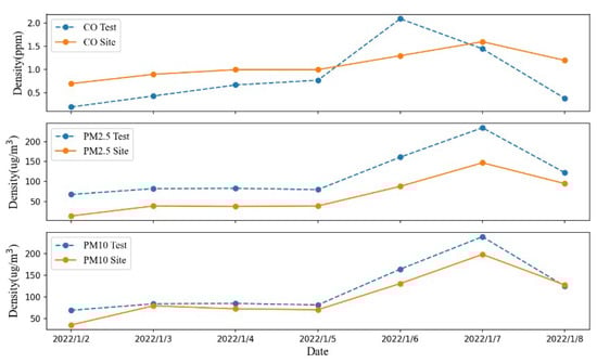 A total of 14 gas data are obtained for the experiment: 2 per day. Each measurement lasts about 20 min, and the measured air pollution components are CO, PM2.5 and PM10. The average value of the measured data for each day was selected as the atmospheric pollution gas concentration on that day, and compared with the daily air quality data released by the Huaihe Road State Control Station of the Tianjin Ecological Environment Monitoring Center (about 10 km away from Hebei University of Technology), As shown in Figure 9. The solid line is the site data, and the dashed line is the experimental result of environmental measurement. Taking mean absolute error (MAE) and root mean square error (RMSE) as evaluation indicators, the smaller the value of the evaluation indicators, the smaller the error. The results are shown in Table 4.