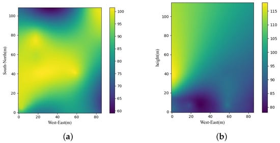 We randomly selected one day’s experimental data, used the Kriging interpolation method to interpolate the gas data, and analyzed the distribution of polluted gases in the measurement space. The results of PM2.5 interpolation are shown in Figure 10. It can be seen from the interpolation results that the concentration of pollutants on the line from the southwest to the northeast of the detection space is higher than that of other areas, and the concentration gradually decreases with the increase in height and longitude. This may be the result of the spread of pollutants from road vehicles and canteens in the southwest of the detection area to the northeast.