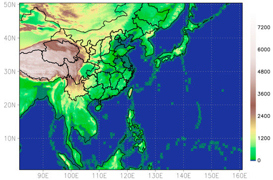 CMA-TRAMS is based on the Global/regional assimilation and prediction system (GRAPES) non-hydrostatic mesoscale model. The semi-implicit-semi-Lagrangian time difference scheme is applied in this model. The model has a longitude–latitude grid, the Arakawa-C grid leapfrog scheme, and the Charney–Philips vertical layering scheme. The vertical coordinate of the model is the height terrain-following coordinate. A series of technical solutions for model dynamical frame have been implemented based on the original GRAPES model. For example, the three-dimension reference profile has replaced the one-dimension reference profile. More recent studies have improved the step-by-step calculation method for the nonlinear term in the semi-implicit-semi-Lagrangian time difference scheme and the coupling technology between the dynamical and physical processes [36]. At present, the physical schemes of this model include RRTMG long and short wave radiation, Weather Research and Forecasting (WRF) Single-Moment 6-class (WSM6) microphysical, improved New Simplified Arakawa-Shubert (NSAS) convective parameterization scheme [37], Simplify Model for land Surface (SMS) parameterization scheme with forecasts of the soil moisture in the shallow soil layer [38], New Medium Range Forecast (NMRF) boundary layer parameterization scheme [39], and gravity wave drag induced by the sub-grid orograph parameterization scheme [40]. Furthermore, the physical process considers the coupling between the convective parameterization scheme and the microphysical scheme is considered [41]. The revised near-surface heat flux formula in this model could improve the forecast of typhoon track and intensity [42]. The model used in this study ranged from 70° E to 160° E in the meridional zone and from 0.8° N to 54.8° N in the zonal zone (Figure 1). The horizontal grid size was 0.09° × 0.09° and there are 65 vertical layers in this model. The integration time step in this model is 90 s.