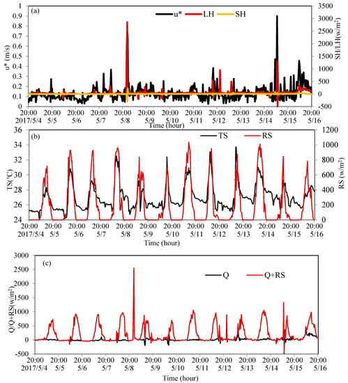 Changes in the observation datasets with time at BoHe Base: (a) u* (black line), LH (red line), and SH (orange line); (b) (black line) and RS (red line); and (c) Q (SH + LH + RL) (black line) and Q + RS (red line).