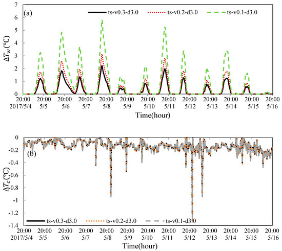 Three sets of trials (including seven total sub-experiments) were designed, as listed in Table 1. The sensitivity experiments of ν are ts-v0.1-d3.0, ts-v0.2-d3.0, and ts-v0.3-d3.0, respectively. The experiments of are tsd-v0.2-d3.0 and tsm-v0.2-d3.0, respectively. The experiments of d are tsm-v0.2-d2.5 and tsm-v0.2-d3.5, respectively. Figure 3a (including three sub-experiments) shows the time-dependent changes in in the first set of experiments. Three sub-experiments had diurnal variations in , which are basically consistent with the diurnal changes in the solar radiation. When ν is set to 0.3 (ts-v0.3-d3.0), the amplitude of is below 2.3 K, with a peak of 2.234 K, which is below the results reported in Fairall et al. [1] and Zeng et al. [9] (i.e., of approximately 3 K). This may be related to the magnitude of the surface solar radiation peak. When ν is reduced to 0.2 (ts-v0.2-d3.0), the amplitude of increased and the peak, at 3.135 K, agreed with previous studies. Furthermore, when ν is reduced to 0.1 (ts-v0.1-d3.0), a large increment existed in the amplitude of and the peak is above 6 K. Such a significant variation in may be unbalanced in the two terms on the right-hand side of Equation (9). Therefore, considering the characteristics of the observational dataset and the variation in the amplitude of , we set ν to 0.2. Here, has a negligible relationship with ν (Figure 3b) and its amplitude varies between 0 and 1.0 K, except for individual times exceeding 1.0 K at the peak of 1.326 K.