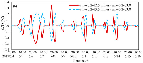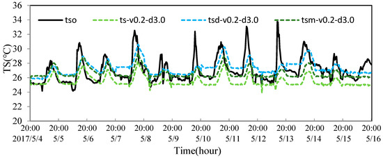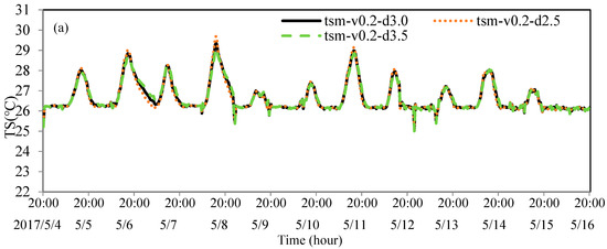 The sensitivity experiments (Figure 4) shows that the simulated reflects the diurnal variation and the peak in the diurnal variation has a hysteresis similar to the findings reported in Zeng et al. [9]. When is equal to the at the initial moment (ts-v0.2-d3.0), the trend in the simulated over the first two days is more consistent with the observation. The peak during the day is slightly smaller, whereas that during the night is similar to the observation. However, after two days, the simulated is lower than the observation, with a deviation of approximately −2 K at night and an ever more notable value during the day (up to ~7–8 K). After considering the diurnal variation in (tsd-v0.2-d3.0), the simulated is generally higher than that in the ts-v0.2-d3.0 experiment. The peak during the day is closer to the observation, whereas the temperature at night is higher. When is set as the monthly average (tsm-v0.2-d3.0), the simulated is between the tsd-v0.2-d3.0 and ts-v0.2-d3.0 experiment. In other words, the simulated of tsm-v0.2-d3.0 in the day is lower than the observation while that at night is closer to the observation. Therefore, the choice of is sensitive to the simulated and the appropriate could improve the simulation of .