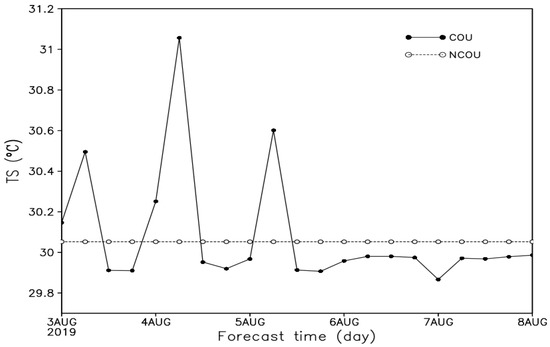 We provide a comparison of the 120-h forecasted at a single point on any day from the two experiments without the observation. Figure 7 shows the 120-h forecasted for 3 August 2019 at a single point (140° E, 20° N). The results show that the simulated of COU has diurnal variation. Especially during the simulation of the first 3 days, the diurnal variation is notable with the maximum temperature at noon (14:00) and minimum temperature at night (02:00). After day 3, more cloud reduces solar radiation reaching the ground due to influence of Typhoon Francisco (1908) in the West Pacific, which results in the diurnal variation decreasing. The of NCOU is fixed during the simulation, which may influence the interaction between atmosphere and ocean.