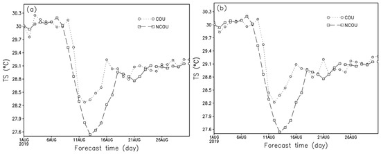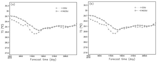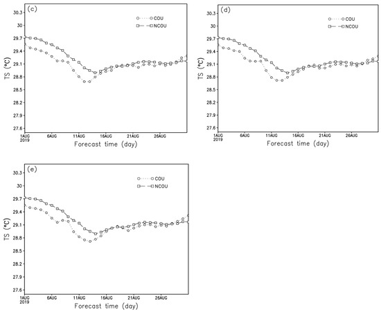Furthermore, Figure 9 shows the regional average of two experiments over the study area (5° N to 25° N, 130° E to 150° E) at 24 h, 48 h, 72 h, 96 h and 120 h every day from August 1 to 31. There is a certain difference in the forecasted of NCOU and COU from August 1 to 15, which is because that several typhoons, such as Typhoon Francisco (1908), Typhoon Lekima (1909), Typhoon Krosa (1910), occurred successively over the above region during the period. The difference of is within 0.5 K. In addition, the of the two experiments reduces due to the influence of typhoons from August 1 to 15. After August 16, the weather over the region is relatively stable and the difference of between NCOU and COU is smaller.