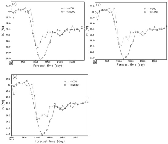 Due to the observed , Figure 8 shows the forecasted at 24 h, 48 h, 72 h, 96 h and 120 h every day from 1 to 31 August in the COU and NCOU experiments along 140° E and 20° N. On the whole, the variation tendency of the forecasted within 120 h in the two experiments are almost identical. The amplitudes of forecasted from 1 to 9 August and from 18 to 31 August are relatively small. However, the forecasted obviously reduces from 10 August and the amplitude is larger during 10–17 August, which is mainly affected by Typhoon Krosa (1910). Specifically, there exists a larger difference of between NCOU and COU during the period influenced by typhoon, while the difference is relatively smaller when there is no obvious synoptic system. The reasons might be that the forecasted has a diurnal variation after considering scheme in the model while the is susceptible to solar radiation. The solar radiation decreases when the cloud cover influenced by typhoon increases which induces the variation of . The differences of forecasted between NCOU and COU are usually within 1 K with the maximum of 1 K on August 13. These show that there exists a certain difference of whether the scheme is coupled with numerical model under the obvious synoptic system.