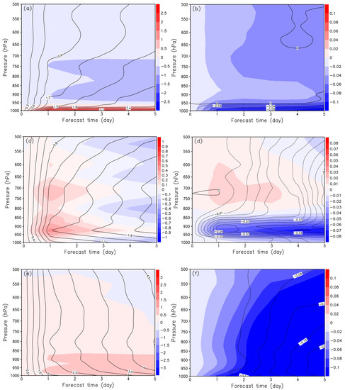 Time-pressure cross-sections of the biases (shaded) and RMSEs (contour) for the temperature (K), specific humidity (g kg −1), and wind speed (m s −1) in (a,c,e), respectively. NCOU against the EC analysis data and (b,d,f) their differences between the NCOU and COU (i.e., COU minus NCOU), averaged over the model region during August 2019. Solid and dashed lines indicate positive and negative values, respectively.