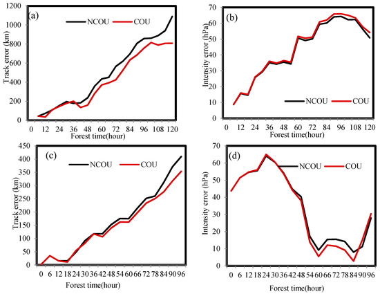 Errors for the track (a) and intensity (c) for the 1616 “Malakas” typhoon and (b,d), for the 1622 “Haima” typhoon.