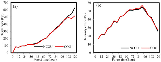 Average errors for the track and intensity from six typhoons: (a) track and (b) intensity errors.