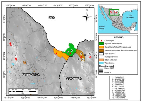 The MDCPA encompasses an area of 208,381 ha in the municipalities of Ocampo, Muzquiz, and Acuña, Coahuila, Mexico. Elevation varies from 500 to 3100 m and precipitation ranges from 100 to 400 mm at the MDCPA. Mean annual temperature varies from 18 to 22 °C. These conditions favor the presence of different vegetation communities along the elevation gradient; thus, desert grasslands and shrublands dominate low elevations, and mixed-conifer forest dominate upper elevations. Dominant vegetation above 1600 m elevation is composed by a piñon–juniper community (1400 to 2700 m), pine–oak forests (1900 to 2600 m), and fir–cypress forest (1600 to 2700 m) with the presence of Psedutosuga menziesii Mirb., and Abies durangensis var. Coahuilenses [].