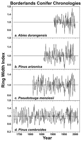 The polished cores and cross-sections were crossdated following standard dendrochronological procedures []. Ring widths were measured with a Velmex measurement system to a precision of 0.001 mm, and the measured time series were screened for dating or measurement errors using correlation analyses in the computed program COFECHA [,]. The Signal Free method was used to compute the ring-width index chronologies [,]. However, the Signal Free approach requires large sample sizes for best results, and some of the borderlands datasets are based on relatively few trees. Consequently, we computed the chronologies used in this study as the robust mean value of the index series that were detrended and standardized based on an age-dependent spline function. The variance of the derived mean index chronologies was also then stabilized by the methods outlined by Meko et al. [] and Stahle et al. []. A regional average ring-width index chronology was computed for each species and plotted for comparisons between the species.