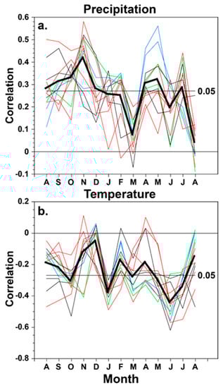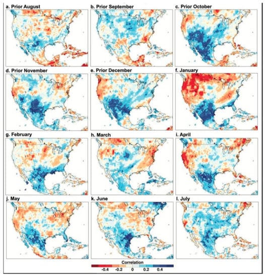 The time series scores for the first principal component of tree growth for the 12 chronologies were correlated with gridded monthly precipitation and temperature over North America from the previous August to the current August to map the intensity and spatial pattern of the climate signal in the borderland tree-ring chronologies (Figure 4 and Figure 5). Note the strong and widespread correlation between PC1 of conifer tree growth from the borderlands region and gridded precipitation over Texas and northern Mexico beginning in October of the year prior to growth and extending most strongly through January (Figure 4). Note also the dipole pattern of positive and negative precipitation correlations most vividly evident in January (also seen in correlations between instrumental precipitation totals; Dettinger et al. []). The positive precipitation correlation over the borderlands extends into the summer concurrent with tree growth, but it is much weaker, especially in March (Figure 4).