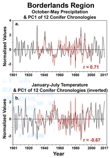The instrumental precipitation data were totaled monthly for each grid point and then averaged for the study area (28.5–30.5° N and 102–107° W) for 1901–2017. These regional precipitation data were then summed for the October–May cool season and correlated with the PC1 scores for the 12 conifer chronologies from the borderlands for the common period 1931–2000 ((a); PC1 in red). The correlation is r = 0.71 (p < 0.001). The monthly temperature data were also averaged for the study area and for the months of January–July (plotted for 1901–2017; (b)). The PC1 time series of tree growth was inverted and is plotted along with the regional temperature series. The correlation is r = −0.67 (p < 0.001), prior to inverting the PC1 time series. Regional precipitation for October–May has generally declined since the wet extremes in the 1980s and 1990s (a) while January–July temperatures have increased over the region (b). Some of the tree-ring chronologies unfortunately end in 2000, but the PC1 time series does follow the low-frequency changes in both seasonal precipitation and temperature over the borderlands region.