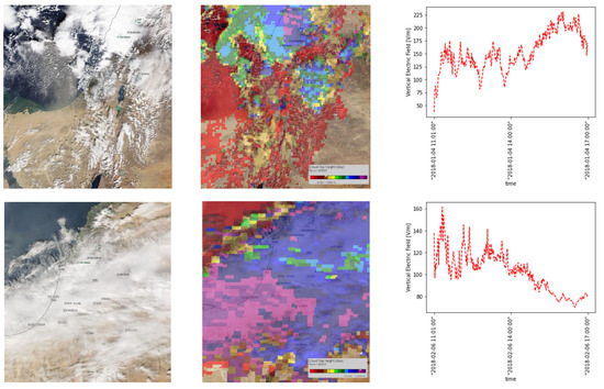 Figure 1 presents two examples for the usage of satellite images and the PG variations during daytime hours (11–17 LT). Slightly higher PG values (mean ~160 V m−1) compared with normal fair-weather values (mean ~150 V m−1) were recorded for the 4 January 2018 event, which was dominated by a low cloud layer (Figure 1 top). Substantially lower PG values (mean ~102 V m−1) relative to the normal fair-weather values (mean ~170 V m−1) were recorded for the 6 February 2018 event, which was dominated by a high cirrus cloud layer (Figure 1 bottom).