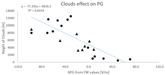 The height of clouds and their effect on the measured ground level PG. Circles are single layer of clouds while the triangles are a superposition of two or three types of clouds and are the average height. (for example, a presence of a ~10 km high cirrus cloud together with a ~1500 m stratus layer is indicated as a single combined height of 5750 m).
