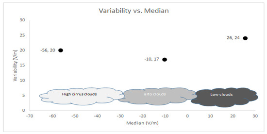 Figure 3 shows the median value as a function of the variability representing the effects of the various cloud layers. The ∆PG from fair weather values of low clouds is 26 ± 24 V m−1, middle level clouds (alto) is −10 ± 17 V m−1 and for high cirrus layers it is −56 ± 20 V m−1.