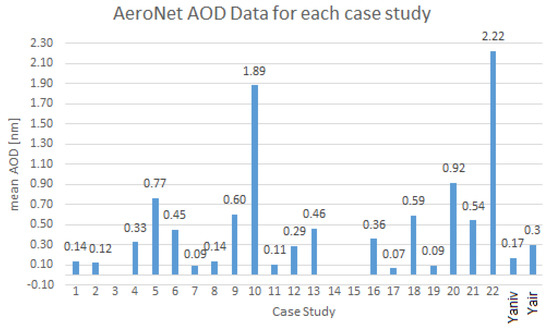 Mean Aerosol Optical Depth values [nm] for 19 out of 22 days and the 0.17–0.3 range of AOD mean fair weather values from previous studies [10,20].