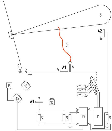 Basic scheme of the experimental measurement complex: 1—charged aerosol generator, 2—grounded electrostatic screens, 3—artificial thunderstorm cell, 4—rod or elongated model electrodes, 5–7—flat antennas, 8—spark discharges, 9—low inductive shunts, 10, 11—digital memory oscillographs, 12—a system of photoelectronic multipliers, 13—digital camera, 14—trigger generator, 15—photoelectron multiplier, 16—electron-optical camera.
