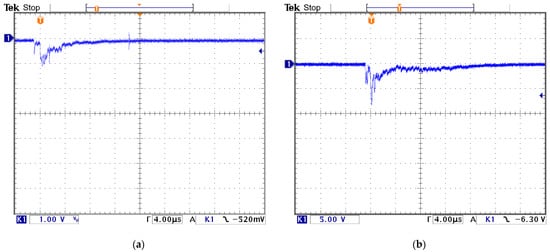 Characteristic photographs of the first pulse streamer corona flash, oscillograms of the first streamer corona flash current, and images of the electron-optical camera for the cases with/without an upward leader transition are shown in Figure 2, Figure 3 and Figure 4.