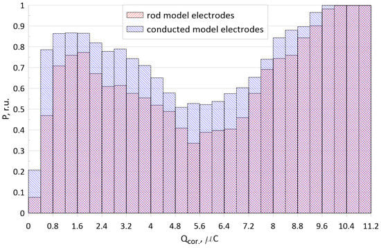 Figure 6 summarizes the results for primary streamer corona flashes for the entire experimental data array of the rod and extended electrodes: rod electrodes with tip radii from 0.05 cm to 3.5 cm (main data array for radii from 0.9 cm to 2.5 cm) and cylindrical electrodes with radii from 0.15 cm to 3.0 cm (main data array for radii from 0.55 cm to 1.75 cm). At different radii and different heights of the electrodes, the probability of a streamer flash passing into an ascending leader was determined, first of all, by the amount of charge flowing through its stem. However, the possibility of forming a streamer flash with a charge value related to the optimal range for moving into the ascending leader, of course, depended on the parameters of the electrode system.