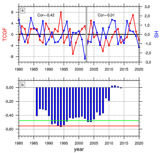 Note that the interdecadal change in the SH–TCGF correlation is dominantly characterized by a striking contrast between 1980–2002 (referred to as P1) and 2003–2020 (referred to as P2). The correlation coefficient is about −0.42 in P1 but −0.01 in P2, whereas the one in P1 approaches the threshold of −0.41 for the 95% confidence level. The difference in correlation coefficients between the two periods is also significant at the 95% confidence level based on the Fisher z transformation [40], confirming a striking contrast in SH–TCGF correlations between P1 and P2.