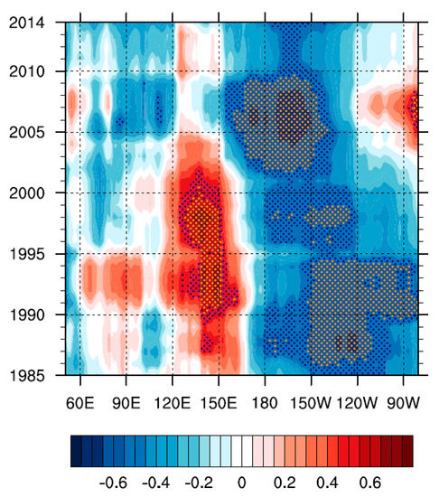 - McPhaden, M.J. A 21st Century Shift in the Relationship between ENSO SST and Warm Water Volume Anomalies. Geophys. Res. Lett. 2012, 39, L09706. [Google Scholar] [CrossRef]