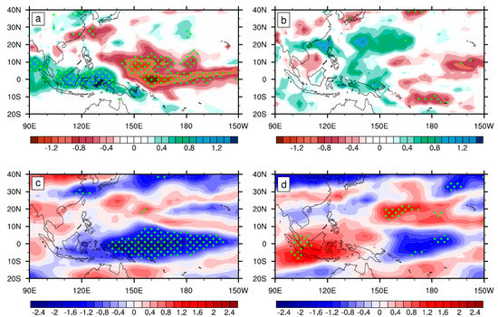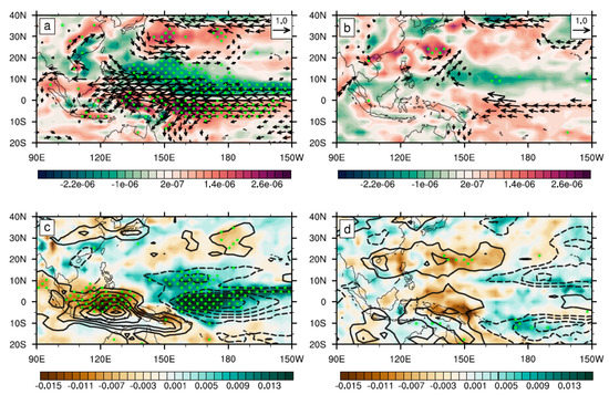 Regression of (a,b) 850 hPa winds (vectors, exceeding the 95% significance level based on the two-sided Student’s t-test, unit: m/s) and relative vorticity (shading; s−1) anomalies, (c,d) 500 hPa vertical velocity (shading, Pa/s) and 700 hPa specific humidity (contours, interval of 0.1 g/kg; zero contours are omitted) anomalies in JJA onto the normalized JFM SH index during (a,c) 1980–2002 and (b,d) 2003–2020. The green dots in (a–d) denote the significant relative vorticity and vertical velocity anomalies above the 95% confidence level based on the two-sided Student’s t-test, respectively.