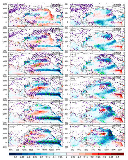 Monthly evolving spatial patterns of the JFM-SH-index-regressed 850 winds (vectors, exceeding the 95% significance level based on the two-sided Student’s t-test, unit: m/s) and SST (shading, °C) anomalies from February to July during (left panel) 1980–2002 and (left panel) 2003–2020. The green dots denote the significant SST anomalies above the 95% confidence level based on the two-sided Student’s t-test.