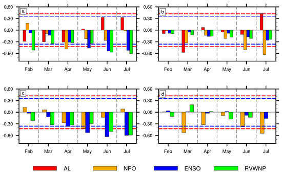 Note that although summer relative vorticity over the WNP can be significantly influenced by previous winter SH through the North Pacific passway (i.e., via AL and NPO) during P1, it is additionally significant in previous winter. As mentioned, EAWM is much weaker during P1 than during P2, which can induce relatively stronger easterly wind anomalies over the tropical western Pacific in winter. In order to avoid the interference of EAWM to the impact of winter SH on the WNP circulation anomaly, partial correlation analysis is utilized, as shown in Figure 7c,d. During P1, after linearly removing the influence of EASM, RVWNP response becomes much smaller in the preceding winter. NPO response is still significant in spring. Negative correlations between JFM SH and Niño3.4 and between JFM SH and RVWNP gradually increase until summer, confirming the North Pacific passway linking winter SH to summer circulation anomalies over the WNP. During P2, the air–sea responses change little after removing EAWM. Moreover, it is noteworthy that the maximum correlation of SH-NPO shifts one month backward after linearly removing the influence of EAWM during P1 (Figure 7a,c). As demonstrated in Figure 6, during P1, EAWM can induce relatively stronger easterly wind anomaly over the tropical western Pacific in winter. This easterly wind anomaly is consistent with the southern flank of the subtropical anticyclonic circulation of negative NPO, which is supposedly conductive to induce direct contribution to the formation of negative NPO. When the influence of EAWM is removed, the North Pacific becomes the only passway indirectly connecting SH to NPO, which needs more time to complete the SH-AL-NPO evolution. This hypothesis may be a reasonable explanation of why the maximum NPO response in Figure 7c is one month later than in Figure 7a, but the detailed mechanism behind it is still worth investigating further.