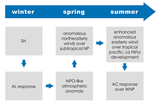 Through examining the air–sea responses over the extratropical Pacific and tropical Pacific, we proposed a plausible schematic summarization of how the SH remotely impacts the environmental background atmospheric circulation anomaly associated with WNP TCGF, which is dominant during P1, as shown in Figure 8. As a response to the strengthened winter SH, there will be an enhanced AL response occurring over the downstream North Pacific. Coming to spring, the anomalous AL response gradually evolves into an NPO-like atmospheric circulation anomaly, which enhances the northeasterly wind anomalies in the subtropical North Pacific. That contributes to the equatorial easterly wind anomalies in summer and then develops a La Niña event through Bjerknes feedback. The equatorial easterlies deflect northward to the WNP, causing an anomalous anticyclonic response and, thus, restrain the genesis of TCs.