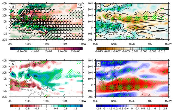 Regression of (a) 850 hPa winds (vectors, exceeding the 95% significance level based on the two-sided Student’s t-test, unit: m/s) and relative vorticity (shading; s−1) anomalies, (b) 500 hPa vertical velocity (shading, Pa/s) and 700 hPa specific humidity (contours, interval of 0.1 g/kg; zero contours are omitted) anomalies, (c) surface precipitation rate (shading, mm/day) anomalies, and (d) vertical wind shear (shading, m/s; 200 hPa minus 850 hPa) anomalies in JJA onto the normalized JJA TCGF index during 1980–2020. The green dots indicate the significant relative vorticity, vertical velocity anomalies, surface precipitation rate anomalies, and vertical wind shear anomalies above the 95% confidence level based on the two-sided Student’s t-test, respectively.