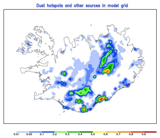 The geo-referenced dust source spatial distribution map for Iceland is made by combining (A) and (B) data sets into a unique dust mask with values ranging from 0 to 1 (Figure 2), where values are proportional to dust emission potential, with the highest values corresponding to highly emissive sources. In accordance with the up-to-date most reliable observational data, the highest weight is given to detect hot-spot source areas and to highlight contributions of these sources, which are noted to be responsible for selected dust transport cases. Other erodible surfaces are included as sources with smaller contributions. These surfaces encompass all potentially dust productive areas capable to produce at least “blowing dust” events [52].
