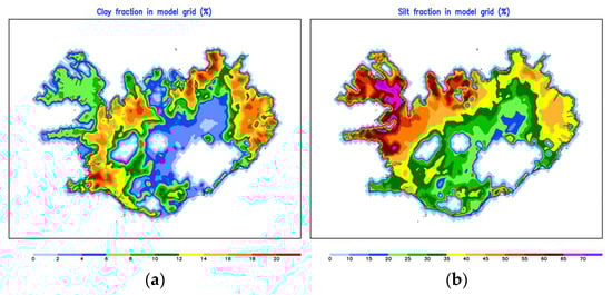 An important soil feature that influences dust emission is the soil texture. Soil surface can be susceptible to wind erosion if it contains clay and silt size particles—up to about 50–60 μm in diameter. During the extreme weather with high surface wind velocity, larger particles can also be suspended from the surface, but over much shorter distances than silt and clay particles. In DREAM, clay and silt particles are included to represent the airborne dust life cycle. Clay particles exist mostly as silt- and sand-sized aggregates and because they are exposed to stronger adhesive forces, they are generally much less available for emission than silt-sized particles [53]. Clay is not a prominent fraction of the Icelandic desert surfaces. Higher clay content is only for the developed andosols, which are not dominant emission sources in the model. In this study, we use the soil texture geographical distribution with the resolution of 1:100,000 [51,54] to populate their fractions over the model grid points, as shown in Figure 3. The clay fraction in model grid is shown in Figure 3a. Higher silt contents (Figure 3b) are typically due to the glaciogenic origin of the sediments, making up the major proportion of sediment loads of glacial rivers. In this dataset, fine particles content in identified hot-spot areas is low [55] (Agricultural University of Iceland, field collected sample data). Accordingly, fine particles content in hot-spots is updated using data from the same field campaign.