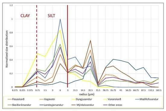Normalized model particle size distributions at measurement sites. Clay and silt particle size domains are indicated with vertical dark red lines. The distributions at Flosaskarð and Hagavatn are the same. Dyngjusandur and Vonarskarð have the same distributions as well.