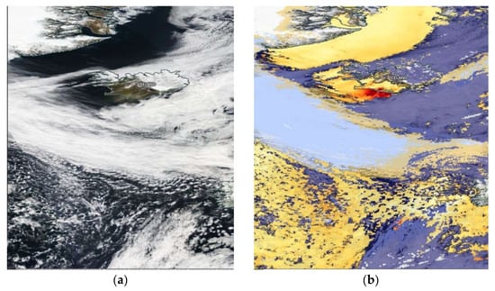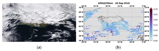 The evidence of the dust storm event in Iceland on 20 September 2018. Detected dust plumes reached Faroe Islands next day: (a) MODIS true color; and (b) MODIS AOD.