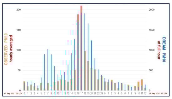 Reykjavik dust storm evidence, time period 12 September 2011 00UTC–13 September 2011 12UTC; orange and red bars: Hourly averaged observed PM10 concentration (µg m−3); blue bars: predicted surface PM10 dust concentration (µg m−3).