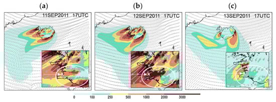 DREAM surface dust concentration (µg m−3) forecast for September 2011 dust storm: (a) The day before the dust storm peak (11 September at 17UTC); (b) at the dust storm peaking hour (12 September 17UTC); and (c) the day after dust storm peak (13 September 2011 17UTC). Reykjavik location is marked with “x” and pointed to with a white arrow. Region within the circle is a dust plume zone.