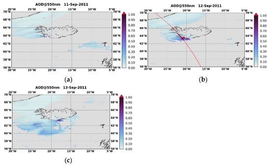 (a–c) MODIS–Aqua AOD at 550 nm representing dust pattern over the period of 11–13 September 2011. The red line on the 12 September (b) image shows the only available CALIPSO overpass.
