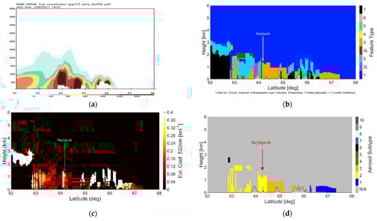 DREAM model and CALIPSO data along satellite path closest to the event, for 12 September 2011: (a) Model dust concentration; (b) CALIPSO vertical profile of recorded feature type with value 3 (aerosol) dominant at detected dust plume region; (c) CALIPSO extinction coefficient that marks detection of the pure dust near Reykjavik; and (d) CALIPSO aerosol subtypes: 1—marine, 2—dust, 3—polluted continental/smoke, 4—clean continental, 5—polluted dust, 6—elevated smoke, 7—dusty marine, 8—PSC aerosol, 9—volcanic ash, 10—sulfate/other.