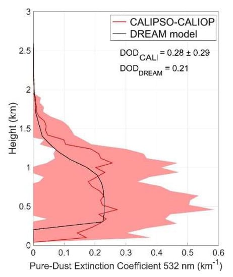 Profiles of observed and predicted dust aerosol extinction coefficient at 532 nm, both averaged over the CALIPSO path are shown in Figure 12. The DREAM model (black line) successfully simulates the CALIOP-based pure-dust extinction coefficient averaged profile (red line), reproducing the vertical structure both qualitative and quantitative, falling well within the variability of the transported dust plume (±1 σ—shaded area). Such low dust layer is typical for high latitudes, as a consequence of the dominating shallow mixing layer conditions [77].
