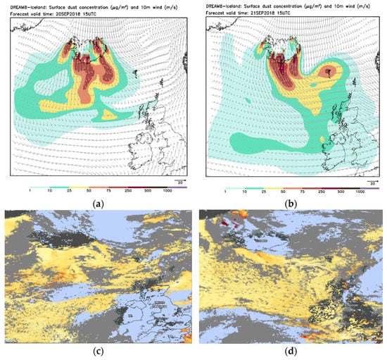 The model predicted massive dust storm on 20 September 2018, lasting more than 24 h (Figure 14a,b) and the maximum surface dust concentrations reached Faroe Islands on 21 September (Figure 14b). Another branch of the same system arrived at the British Islands on the afternoon hours of the same day. Atmospheric circulation characterized by intense north–west winds, dispersed dust towards the Faroe and British Islands as indicated also by the MODIS AOD images (Figure 14c,d).