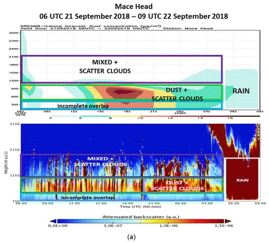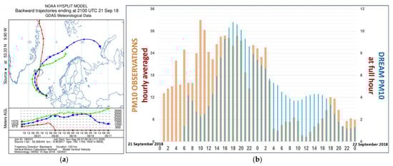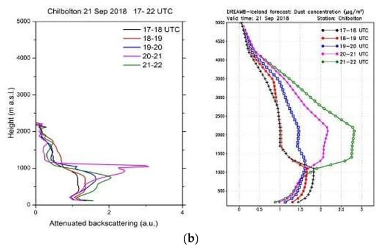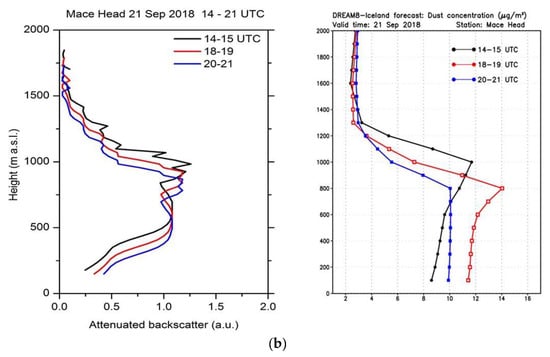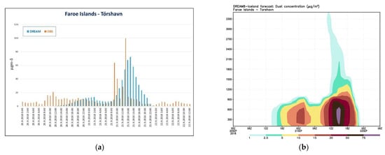 Faroe Islands (Torshavn)—Dust episode 21–22 September 2018: (a) Observed (orange) and predicted (blue) PM10 concentrations (µg m−3); and (b) time–height plot of dust concentration (µg m−3).
