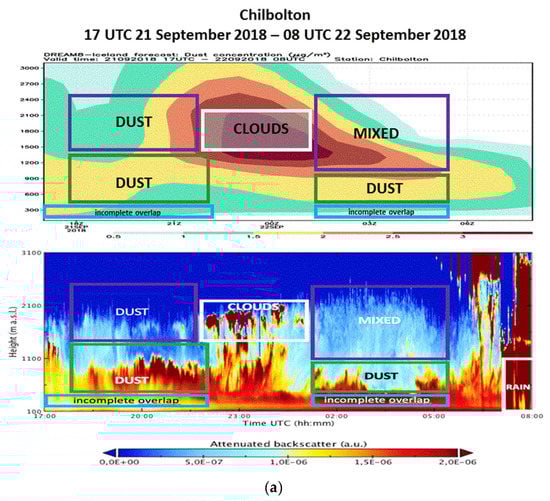 For the two selected stations in Great Britain (Chilbolton) and Ireland (Mace Head), we present the height–time evolution of the dust event as represented by ceilometer observations (Appendix D) and model data (Figure 16 and Figure 17, respectively).